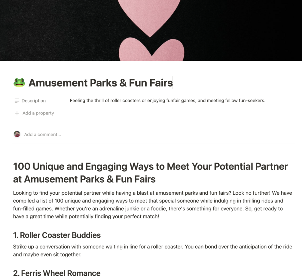 โค๏ธ Overview: Dive into the ultimate Notion template dedicated to all the romantics out there: "10,000 Ways to Meet The One". Whether you've just begun your quest for love or are reigniting the flames, this comprehensive guide is your treasure map to romance.